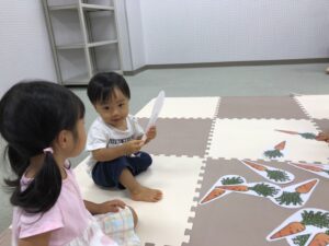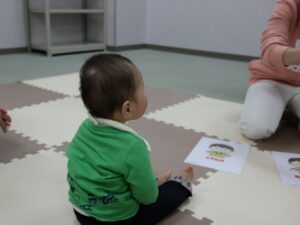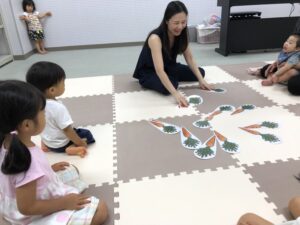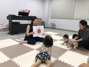音楽に合わせて英語のお歌を歌ったり、絵本を読んだり英語がいっぱいのレッスンです。